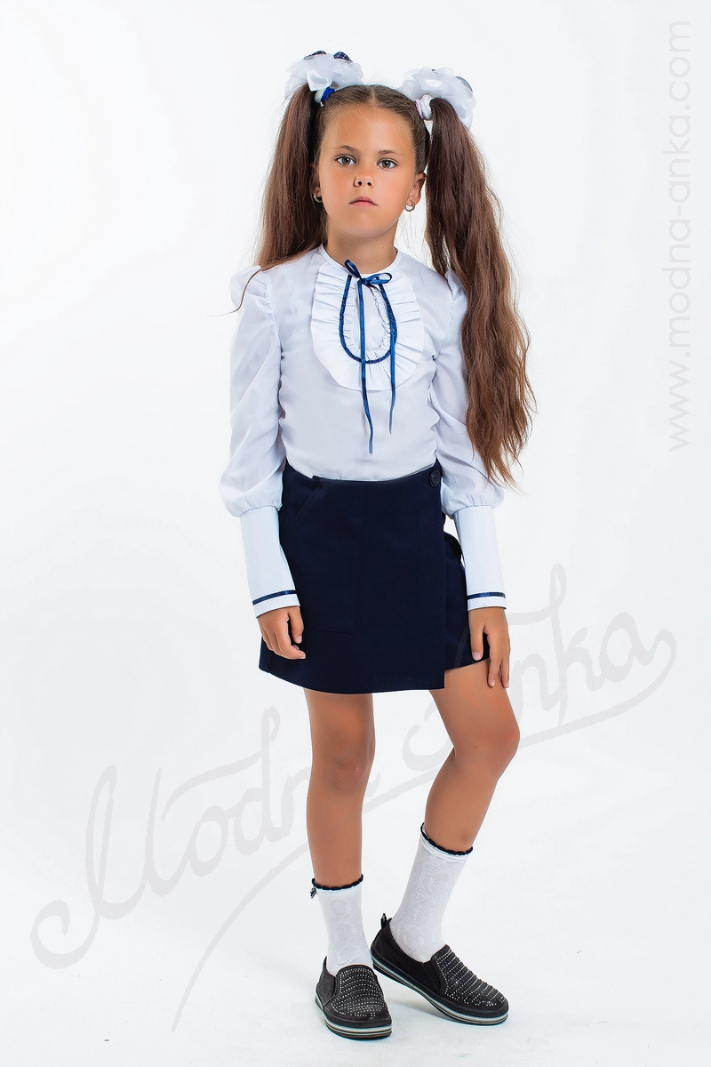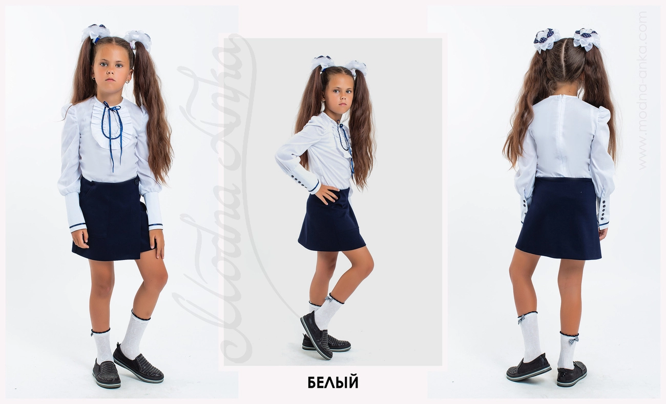 Детская школьная блузка из бенгалина. Застежка молния на спинке. Длинные рукава-фонарики с широкими манжетами.
