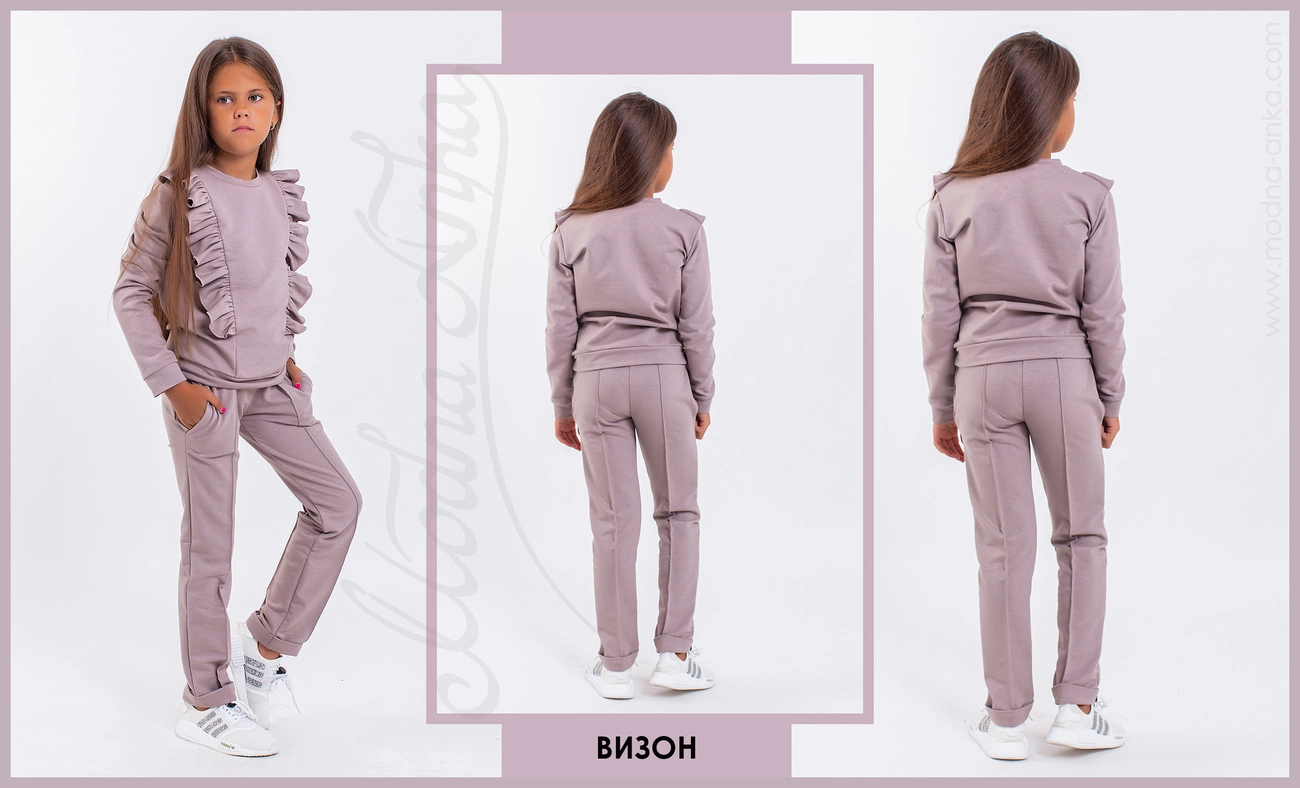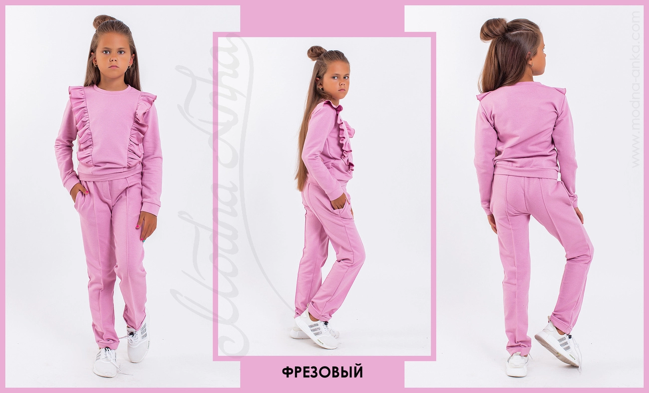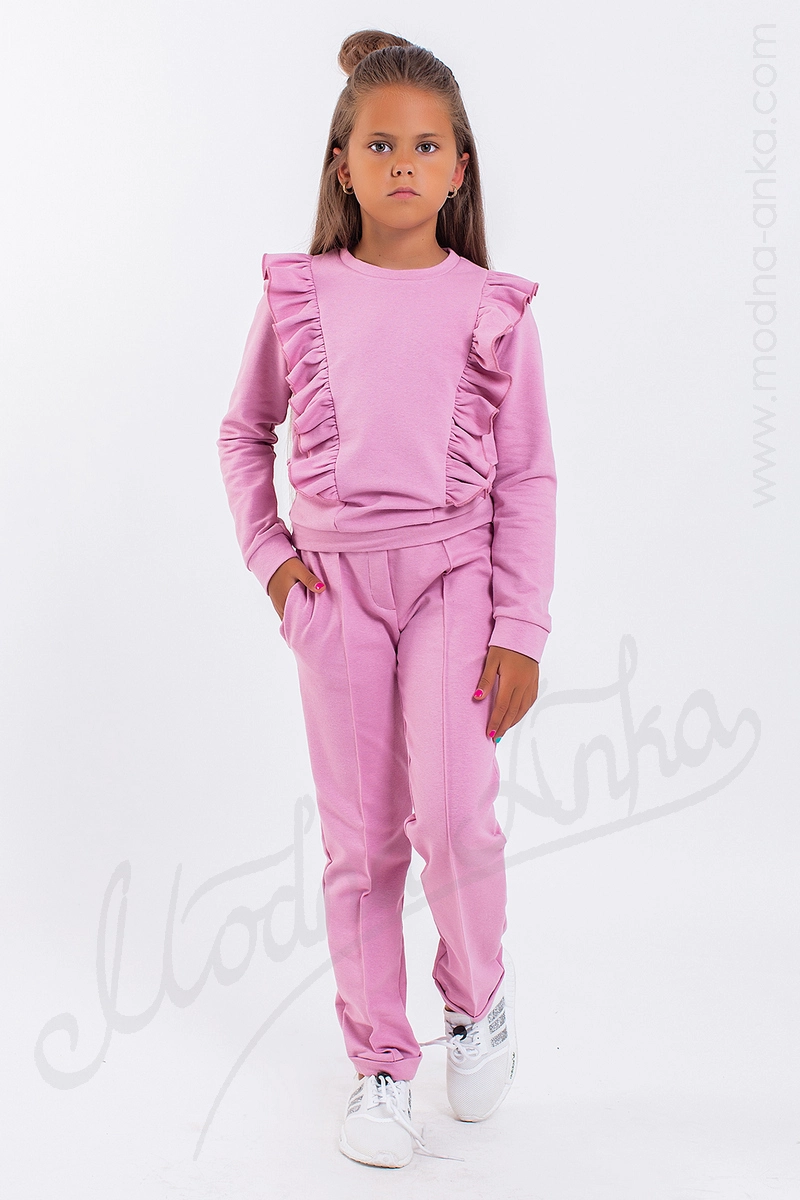 Детский спортивный костюм (свитшот, брюки) из двухнити. Брючки без манжет, но с подворотами, спереди и сзади стрелочки. Свитшот декорирован оборками. Без застежек.