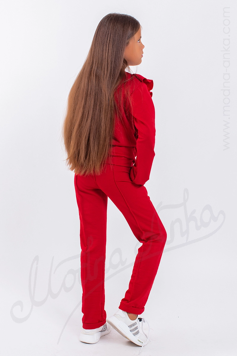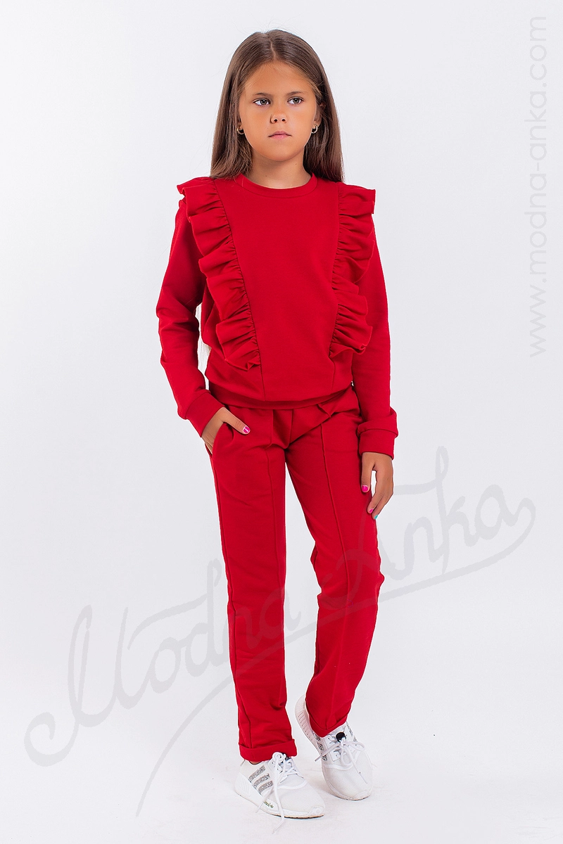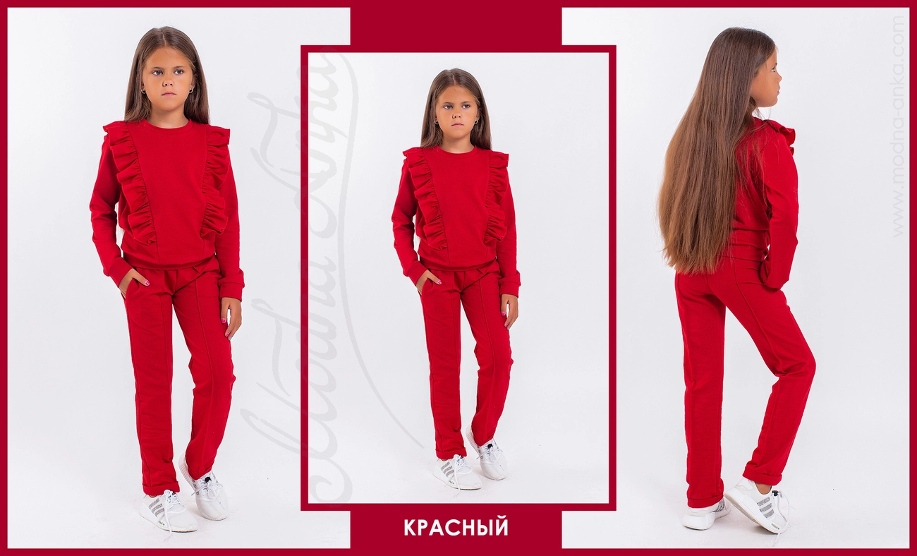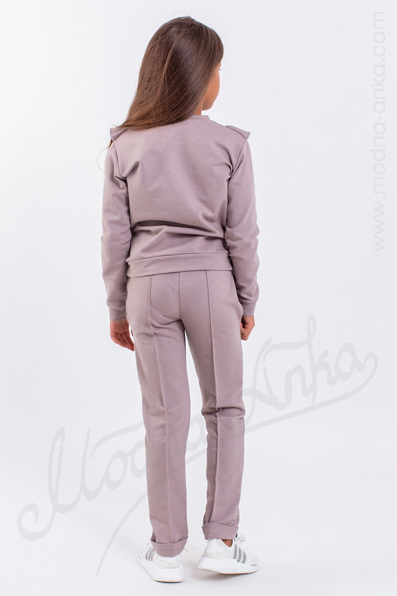 Детский спортивный костюм (свитшот, брюки) из двухнити. Брючки без манжет, но с подворотами, спереди и сзади стрелочки. Свитшот декорирован оборками. Без застежек.