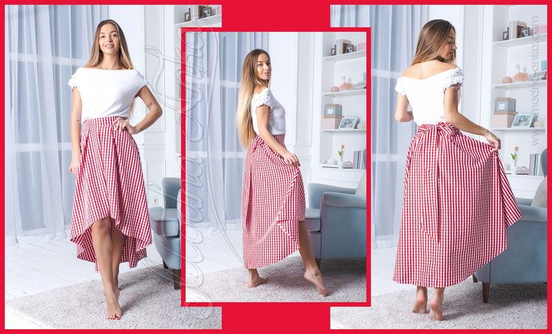 Пояс-завязка вшит в боковой шов. Пояс юбки сзади на резинке.